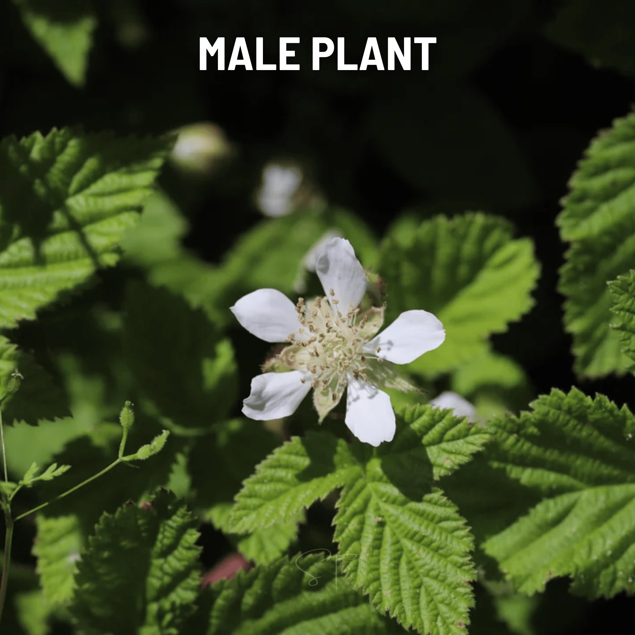 • This species has separate male and female flowers. It's best to grow several plants to ensure you have both for successful pollination and fruit production. Male flowers have larger petals and numerous stamens, while female flowers have smaller petals and numerous pistils. The female plants produce the characteristic elongated, black blackberries. One male plant can pollinate many female plants within 30-50 feet.
